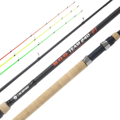 La Caña Surfish BOG TEAM 2T es una caña de alta calidad, disponible en longitudes de 2.40 y 2.70 metros. Consta de 2 tramos y punteros, y viene con 3 punteros intercambiables para adaptarse a diferentes necesidades de pesca. Su composición especial de fibra le proporciona resistencia y flexibilidad. Con un casting weight de 20-40lbs, es ideal para pescar especies de gran tamaño. El grip en corcho portareel a rosca ofrece un agarre cómodo y seguro.
